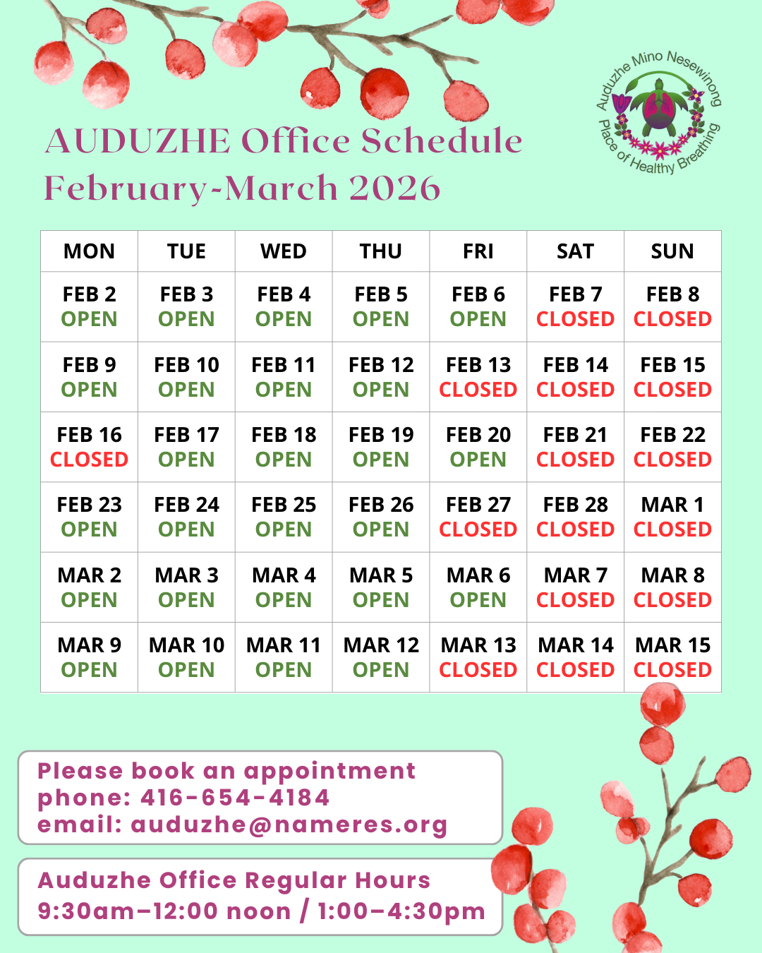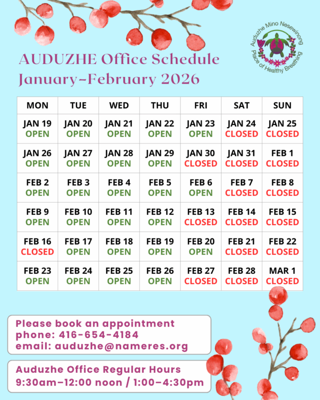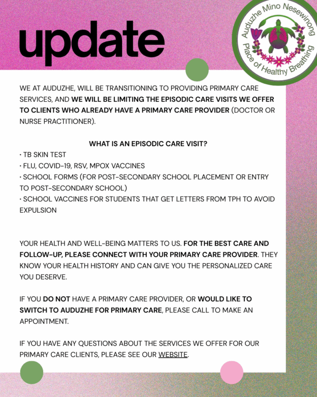 At Auduzhe Mino Nesewinong (Auduzhe), we’re dedicated to providing a culturally safe, accessible, and holistic approach to healthcare for First Nations, Inuit, and Métis community members in Tkaronto. Our commitment to equality and respect ensures that everyone who walks through our doors is embraced warmly. Through a harmonious blend of Western medicine and traditional healing practices, we foster the well-being of both body and spirit.